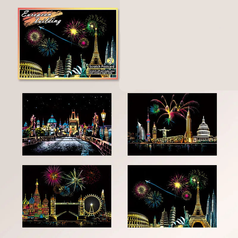 Children's DIY Night Scene Art Scratch Painting Postcards Toys City Building Landscape Kids Educational Toys Room Decor Gift 4Pcs