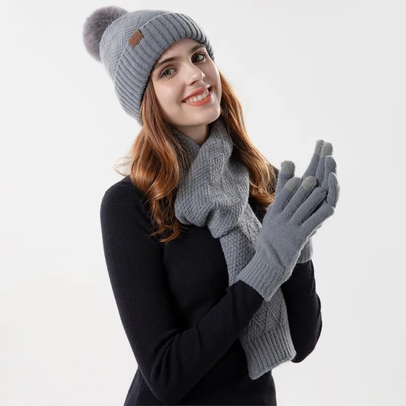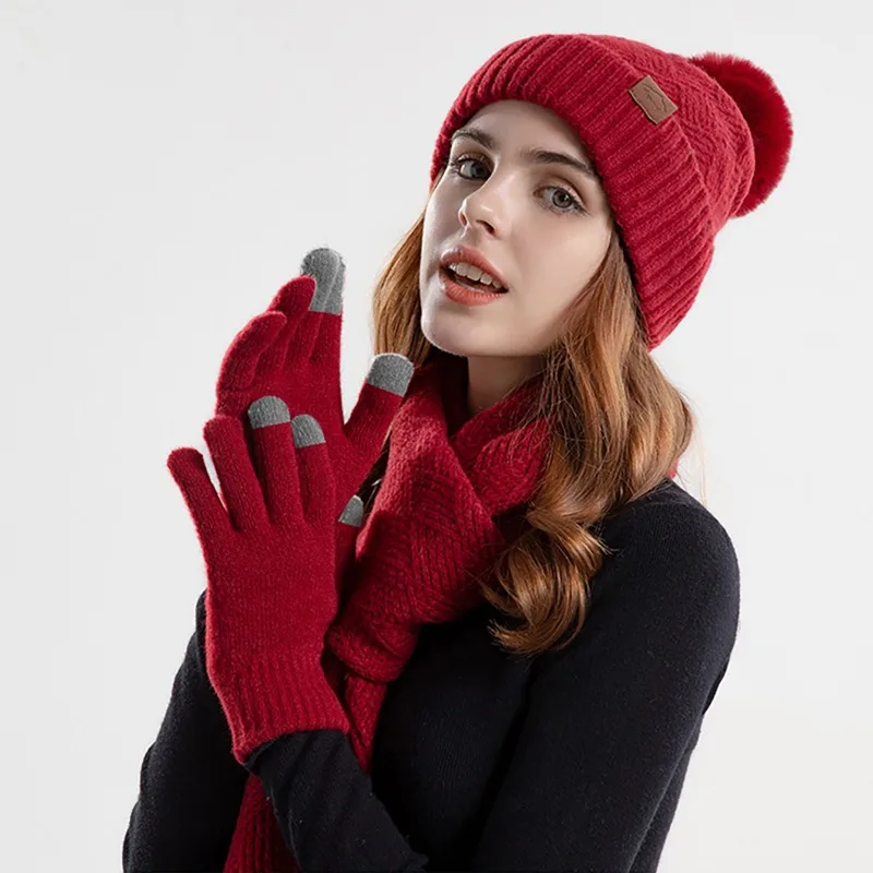 Hat Scarf Touchscreen Gloves Winter Set for Women Girls Warm Knit Fleece Lined Beanie Hat Fur Ball Cap